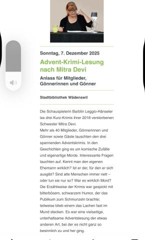 Advent-Krimi-Lesung mit Kurzgeschichten von Mitra Devi in der Stadtbibliothek Wädenswil. Matinee (geschlossene Gesellschaft für Lesegellschaft Wädenswil).