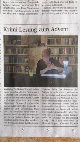 Advent-Krimi-Lesung mit Kurzgeschichten von Mitra Devi in der Bibliothek Marthalen,Maiegass 21, 8460 Marthalen. Beginn 19.30 Uhr.