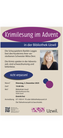 Advent-Krimi-Lesung mit Kurzgeschichten von Mitra Devi in der Bibliothek 9240 Uzwil, Bahnhofstrasse 83a, 9240 Uzwil. Beginn 19 Uhr.